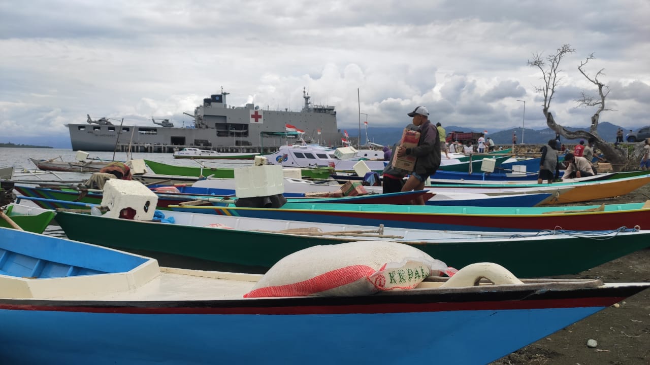 “Seperti yang terlihar di bibir pantai Jalarangas ini, serbuan perahu nelayan yang sandar ini menandakan antusianya masyarakat pesisir yang merupakan korban bencana alam gempa untuk mendapatkan bantuan logistik yang dibagikan oleh pihak TNI AL”, ungkapnya.
