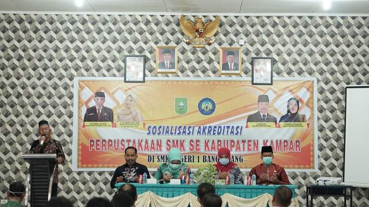 BN Online, Kampar--Sekolah Menengah Kejuruan Negeri 1 Bangkinang (SMKN 1 BANGKINANG) melaksanakan Kegiatan Sosialisasi Akreditasi Perpustakaan SMK Se-Kabupaten Kampar dengan disiplin protokol kesehatan yang dilaksanakan di Aula SMKN 1 Bangkinang, Kamis (18/02/2021).