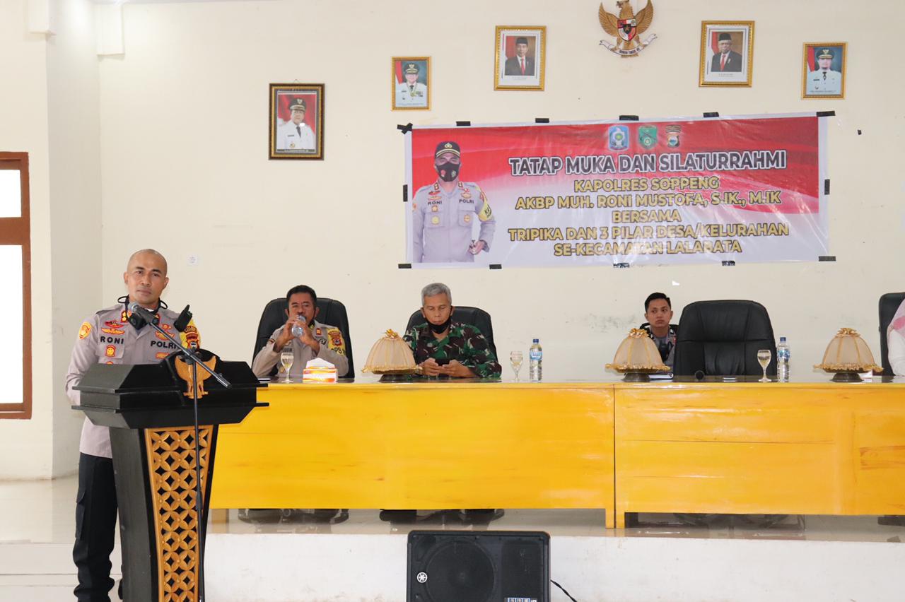 BN Online,Soppeng—-Kapolres Soppeng Akbp Mohammad Roni Mustofa S.I.K M.I.K kembali melaksanakan tatap muka dan silaturahmi dengan Tripika dan Tiga Pilar se Kecamatan Lalabata Kab. Soppeng, Rabu 24 Februari 2021 pukul 09.00 wita.