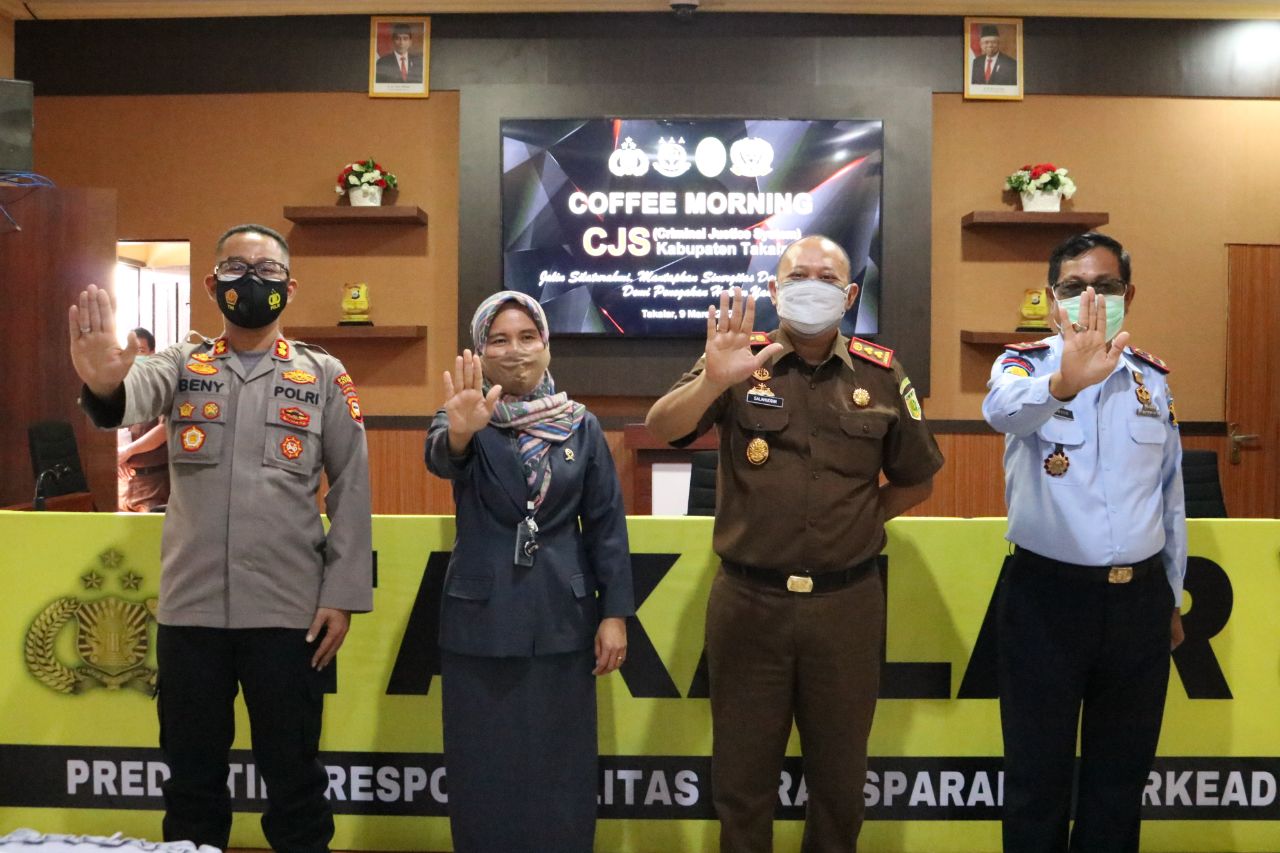Kepala Kepolisian Resort Takalar AKBP Beny Murjayanto S.I.K., M.H. mengatakan bahwa rapat koordinasi diselingi dengan cofee morning ini untuk mendukung program 100 hari kerja Kapolri, dengan tema Criminal Justice System di Kabupaten Takalar.