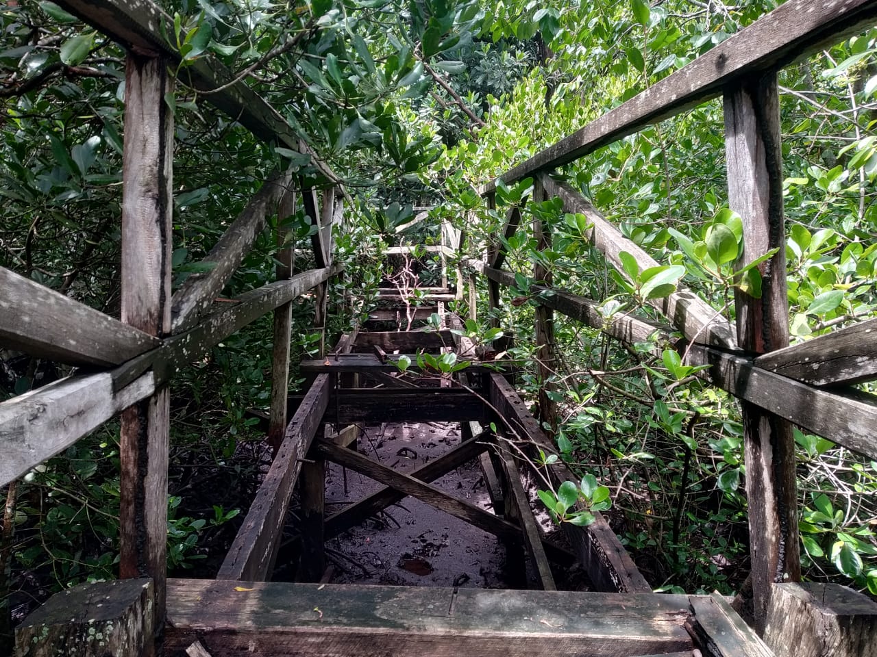 Nampak sebagaian pasilitas jembatan mangrove sudah banyak yang jebol dan bolong.Hal itu tentunya sangat membahyakan para pengunjung wisata saat hendak menikmati tempat wisata tersebut.