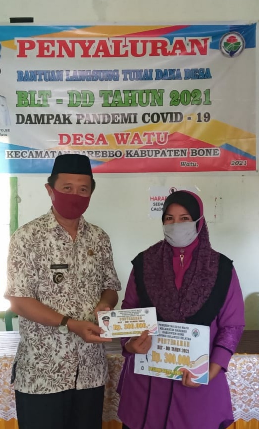 BN Online, Bone—Kepala Desa Watu Kecamatan Barebbo Andi Hasmadianto,SE menyerahkan Bantuan Langsung Tunai Dana Desa ( BLT DD) kepada masyarakat sebanyak 92 orang dengan jumlah sebesar Rp 27.600.000,- untuk tahap 4 Bulan April 2021 bertempat dikantor Desa Watu, Jumat, 23 April 2021.