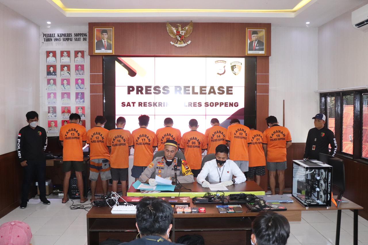 Kapolres Soppeng Akbp Mohammad Roni Mustofa S.I.K M.I.K dalam kesempatannya mengungkapkan bahwa pelaku yang dibekuk sebanyak 10 orang, dari 10 pelaku tersebut 7 diantaranya di bekuk pada tanggal 04 Mei di salah satu rumah di BTN Tompo Tabani Kel. Lalabata Rilau Kec. Lalabata yakni masing – masing Lel. RZD, SD, EP, ED, HR, DD dan SL, sementara dari proses pengembangan, 3 lainnya yakni Lel, HA, AR, WHY dibekuk pada 23 Mei di jl. Balole Kel. Pajalesang Kec. Lilirilau Kab. Soppeng