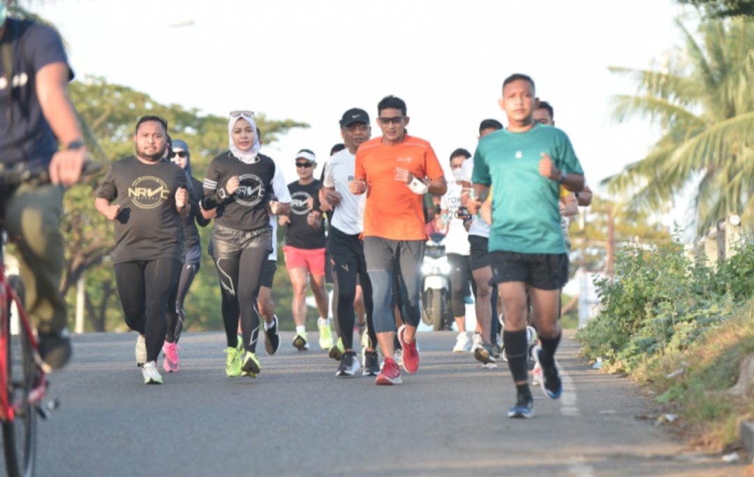 Usai berkeliling dan bertemu dengan Walikota Makassar Moh Ramdhan Pomanto (Danny Pomanto), menteri yang kerap di sapa Sandiaga ini menyempatkan menghirup udara pagi dengan berlari bersama club NRVC (Night Run Vercity), Jumat (18/6/2021).