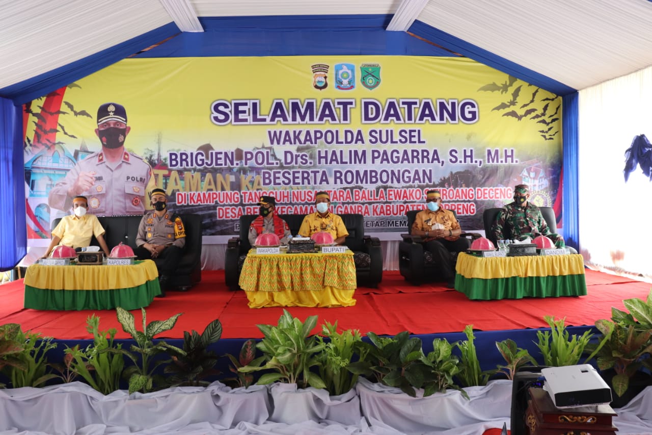 Sementara Wakapolda Sulsel Brigadir Jendral ( Brigjen ) Pol. Drs. Halim Pagarra, S.H., M.H dalam sambutannya mengungkapkan bahwa kunjungannya ke Kab. Soppeng merupakan untuk melaksanakan penilaian Kampung tangguh Balla Ewako sitiroang deceng, dirinya juga mengucapkan apresiasi kepada Bupati Soppeng beserta jajaran atas penyambutannya”.Ujarnya