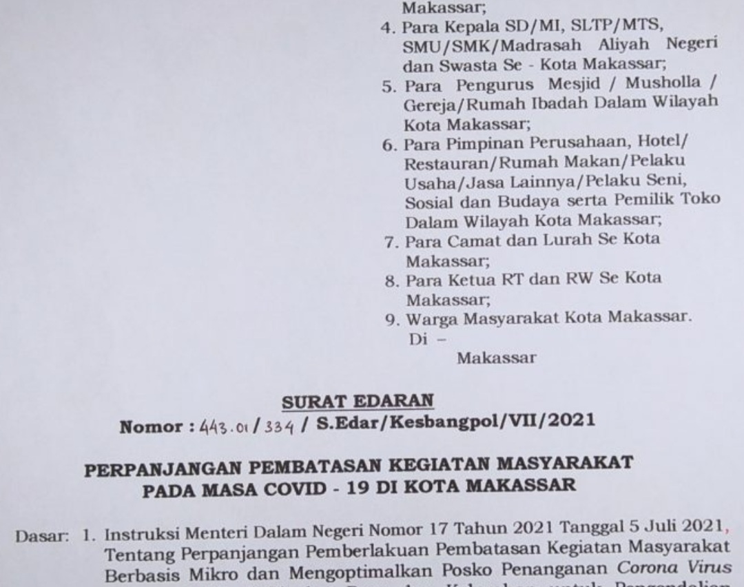 Surat edaran yang dikeluarkan pada 6 Juli 2021 tersebut ditandatangani langsung oleh Wali Kota Makassar, Mohammad Ramdhan Pomanto (Danny Pomanto), sebagai langkah memutus mata rantai penyebaran virus Covid-19 di Kota Makassar yang melonjak tinggi.