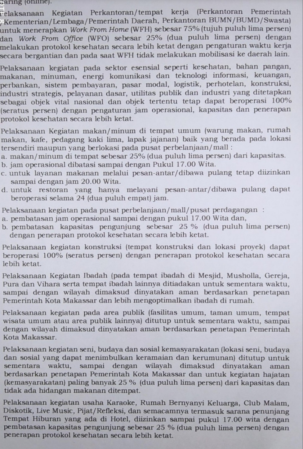 “Pelakasaan kegiatan perkantoran atau tempat kerja baik itu pemerintah, BUMN swasta untuk menerapkan Work From Home artinya kerja dari rumah sebesar 75 persen dan Work From Office atau bekerja di kantor 25 persen dari jumlah karyawan dengan melakukan protokol kesehatan secara ketat,” isi surat edaran Wali Kota Makassar, Selasa (06/07/21).