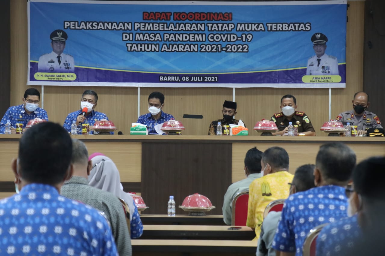 Terkait hal itu, Pemerintah Daerah bersama Forkopimda, Kepala Kantor Kementerian Agama, Kadis Kesehatan, Ketua Dewan Pendidikan, Ketua PGRI, Ikatan Dokter Anak Indonesia, Satgas Covid 19, Kepala Cabang Dinas Wilayah VIII, Pengawas TK/SD/SMP, Pengawas PAIS, Koordinator Penilik, Ketua MKKS SMP dan SMA, Ketua K3S, Perwakilan Komite SD/SMP, dan Ketua PKG Paud menggelar Rapat Koordinasi Pelaksanaan Pembelajaran Tatap Muka Terbatas di Masa Pandemi Covid 19 Tahun Ajaran 2021-2022 yang digelar di Aula Kantor Dinas Pendidikan Kab. Barru, Kamis (08/07/2021).