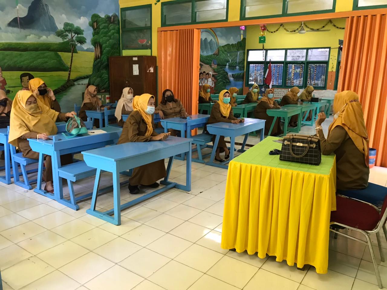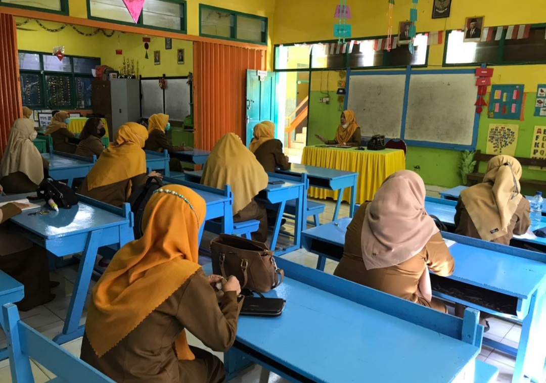 Di sekolah UPT SPF SDN Melayu Muhammadiyah yang hadir hanya kepala sekolah, staf dan guru-guru, Selasa (27/7-2021),