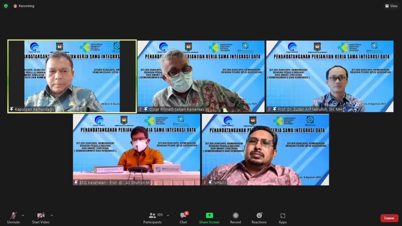 BN Online, Jakarta – Direktorat Jenderal (Ditjen) Kependudukan dan Pencatatan Sipil (Dukcapil) Kementerian Dalam Negeri (Kemendagri) menjalin kerja sama dengan Kementerian Kesehatan (Kemenkes), Kementerian Komunikasi dan Informatika (Kemenkominfo) dan Badan Penyelenggara Jaminan Sosial (BPJS) Kesehatan untuk mengintegrasikan data kependudukan sebagai upaya mempercepat program vaksinasi. Kerja sama itu resmi dimulai, ditandai dengan penandatangan secara virtual oleh Dirjen Dukcapil Zudan Arif Fakrulloh, Sekretaris Jenderal Kemenkes Oscar Primadi, Plt. Dirjen Penyelenggara Pos dan Informatika Kemenkominfo Ismail, serta Direktur Utama BPJS Kesehatan Ali Ghufron Mukti, Jumat (6/8/2021).