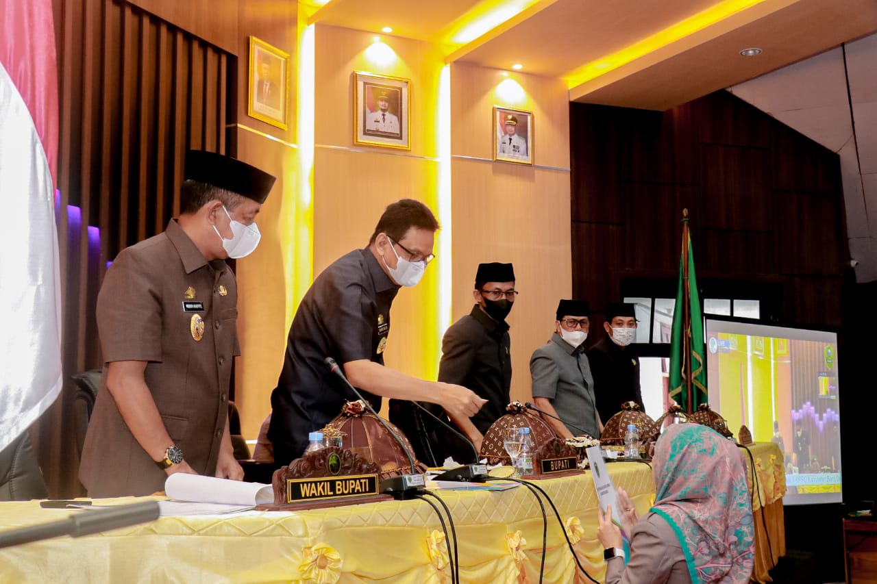 BN Online Barru–Rapat paripurna Tingkat I DPRD Kabupaten Barru dalam rangka penyerahan, pemandangan umum fraksi dan pembahasan terhadap rancangan peraturan daerah tentang Penanganan Covid-19 di ruang paripurna DPRD Kab. Barru, Senin 09/08/2021.