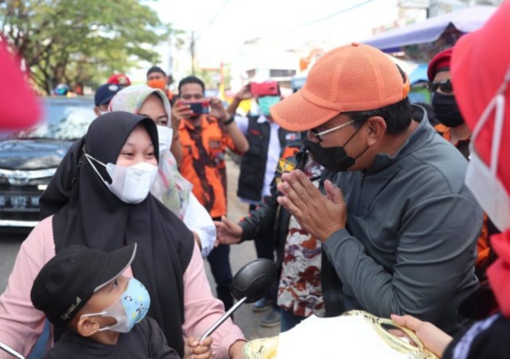 BN Online, Makassar–Walikota Makassar, Moh Ramdhan Pomanto (Danny Pomanto) membagikan masker kepada paengendara yang lewat di depan pasar Antang, Kecamatan Manggala, Minggu (15/8/21).