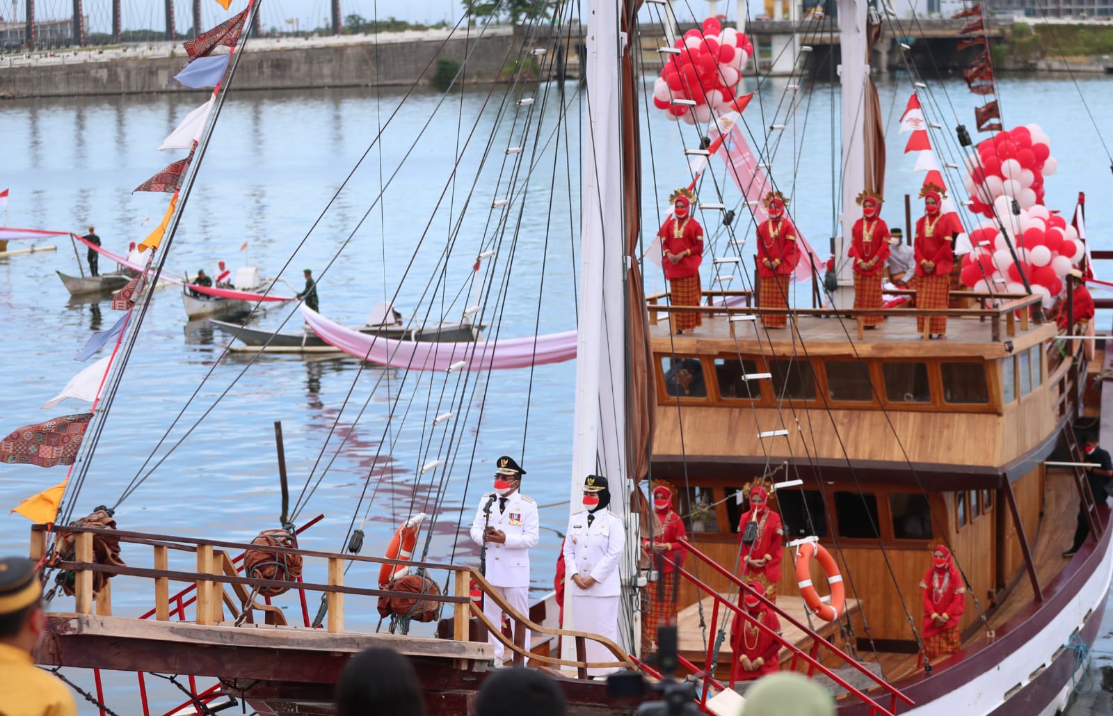 Kapal pinisi sebagai simbol tanah Makassar dengan penari lengkap berbusana adat juga nelayan dengan pakaian khas patonro di dampingi aparat TNI/Polri berjejer rapi membentangkan bendera merah putih di saksikan Wali Kota dan Wakil Wali Kota Makassar serta seluruh SKPD juga Forkopimda Makassar.