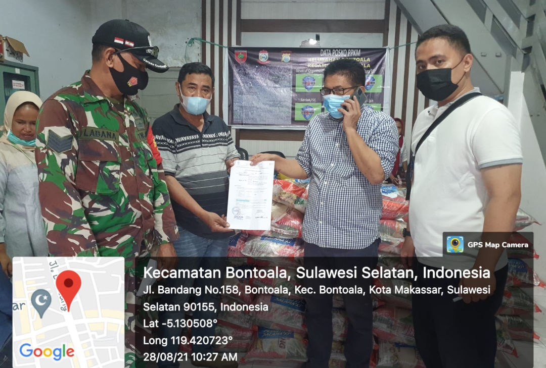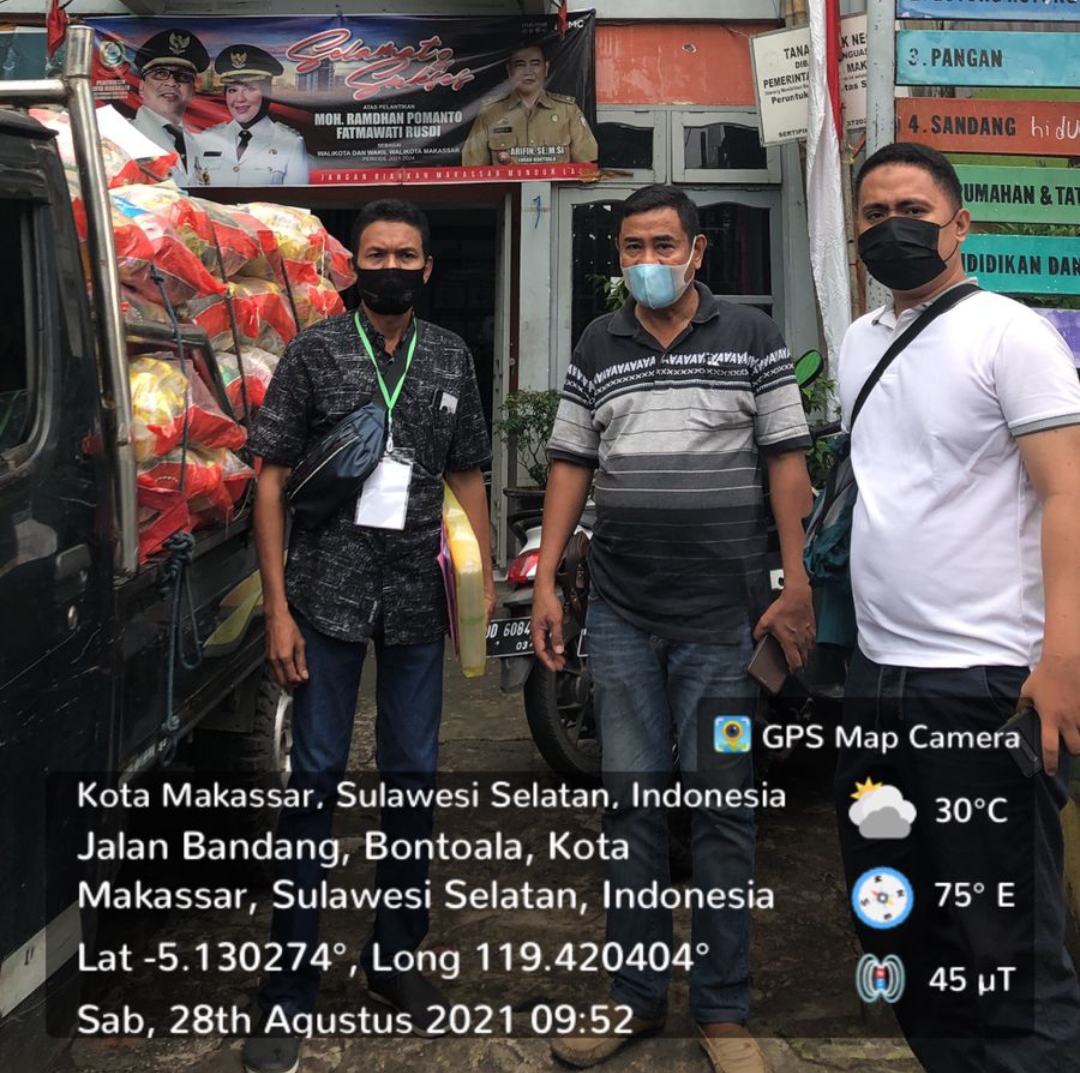 BN Online, Makassar —Arifin, SE., M.Si selaku Lurah Bontoala didampingi oleh Arman Camat Bontoala Makassar, laksanakan pendistribusian paket Bantuan Sosial (Bansos) sebanyak 152 paket yang di distribusikan pemerintah Kota Makassar melalui Dinas Sosial ke masyarakat Kelurahan Bontoala Kecamatan Bontoala Makassar, Sabtu (28/08/2021).