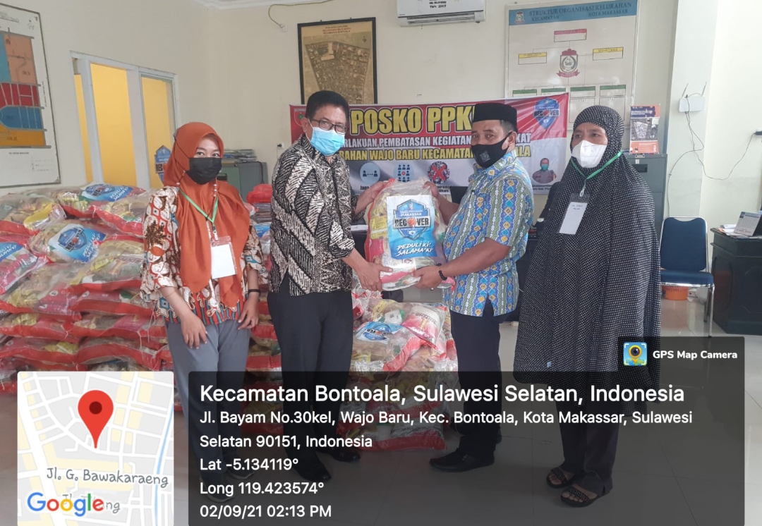 BN Online Makassar–Plt.Lurah Wajo Baru menerima penyerahan sembako yang diserahkan langsung oleh Camat Bontoala Makassar, bantuan sosial tersebut akan disalurkan kepada Warga yang sudah terdata dan terverifikasi oleh Pemerintah di setiap kelurahan, saat ini penyaluran sembako kelurahan Wajo Baru telah didistribusikan, Kamis 02/09/2021.