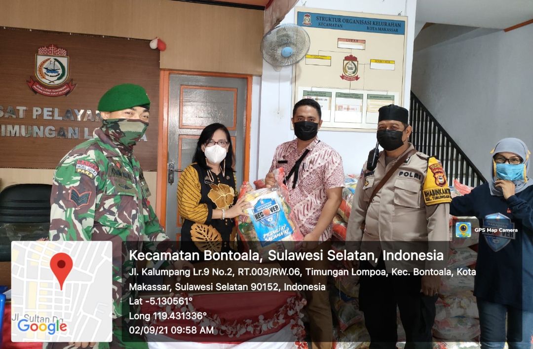 BN Online Makassar–Lurah Timungan Lompoa didampingi Camat Bontoala Makassar, terima bantuan sosial yang akan disalurkan kepada Warga yang sudah terdata dan diverifikasi oleh Pemerintah setiap kelurahan, saat ini penyaluran Sembako kelurahan timungan Lompoa telah didistribusikan, Kamis 02/09/2021.