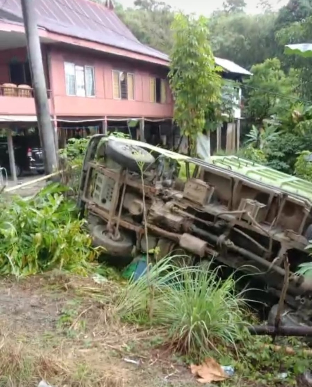 “Pas ditengah pendakian patah As dan rem blong, mundur hingga tabrak tembok hingga terbalik”, kata supir.