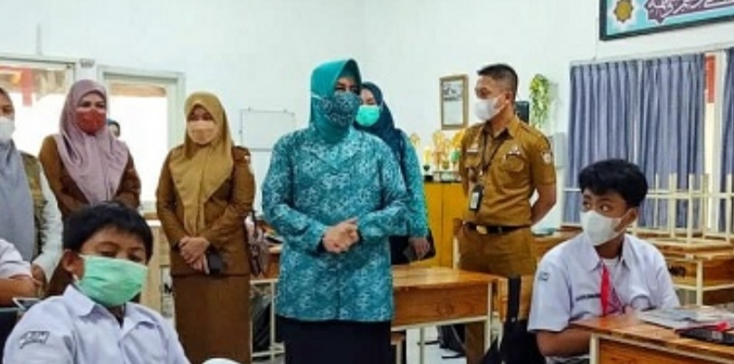 Ketua Tim Penggerak PKK Kota Makassar, Indira Jusuf Ismail, meninjau pelaksanaan di SMP Athirah Bukit Baruga Antang, Senin (04/10/2021).