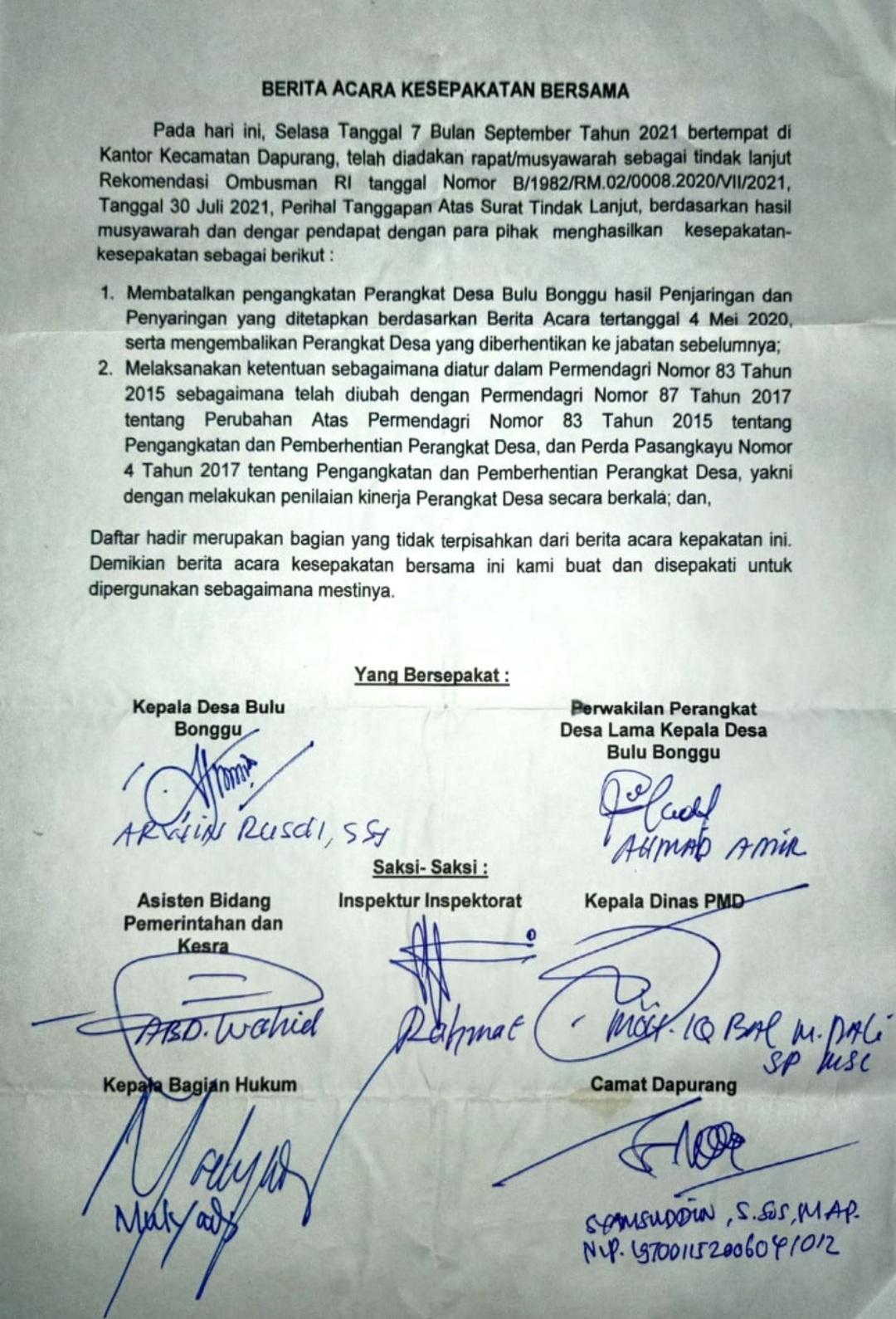 BN Online, Pasangkayu, — Menindak lanjuti berita acara kesepakatan bersama pada 07 September 2021 lalu yang dilaksanakan di kantor Kecamatan Dapurang, Kabupaten Pasangkayu, Provinsi Sulbar, perihal Musyawarah sebagai tidak lanjut rekomendasi Ombudsman RI No B/1982/RM.02/0008.2020/VII/2021, Kepala Desa (Kades) Bulubonggu, Arwin Rusdi, mengambil sumpah jabatan perangkat Desa Bulu Bonggu yang lama, Selasa (05/10-2021).