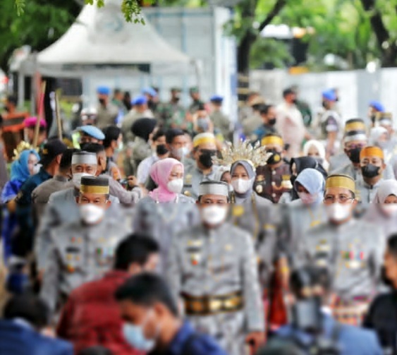 Rombongan Wali Kota bersama Plt Gubernur dan Forkopimda baik Sulsel maupun Makassar sebelumnya tiba di Baruga Anging Mammiri Rumah Jabatan Wali Kota Makassar lalu selanjutnya berjalan kaki menuju anjungan tempat pelaksanaan HUT Makassar 414 tahun.