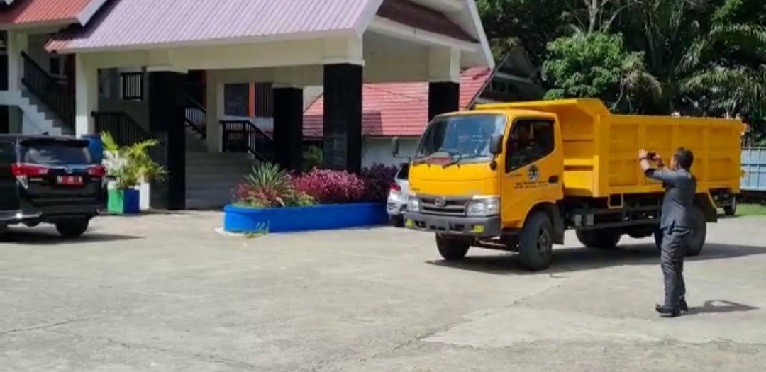 Bupati Wajo didampingi Kepala Dinas Lingkungan Hidup Daerah (DLHD) Wajo, Andi Muhammad Baso Iqbal, menyerahkan mobil Pengangkut sampah jenis dump truck kepada Camat Pitumpanua dan Camat Majauleng di halaman kantor Bupati Wajo, Selasa 9.11.2021