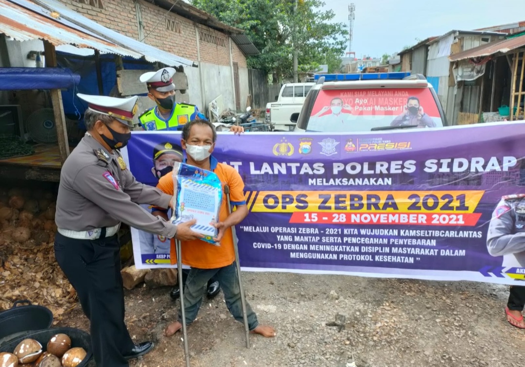 BN Online, Sidrap,–‐ Hari Kesepuluh Operasi Zebra Tahun 2021, Satlantas Polres Sidrap membagikan Sembako bagi warga terdampak Covid-19 serta Pengendara yang tertib berlalulintas, membagikan masker, dan memasang stiker dan leaflet tertib lalu lintas kepada pengendara dan pengguna jalan, Rabu (24/11/2021).