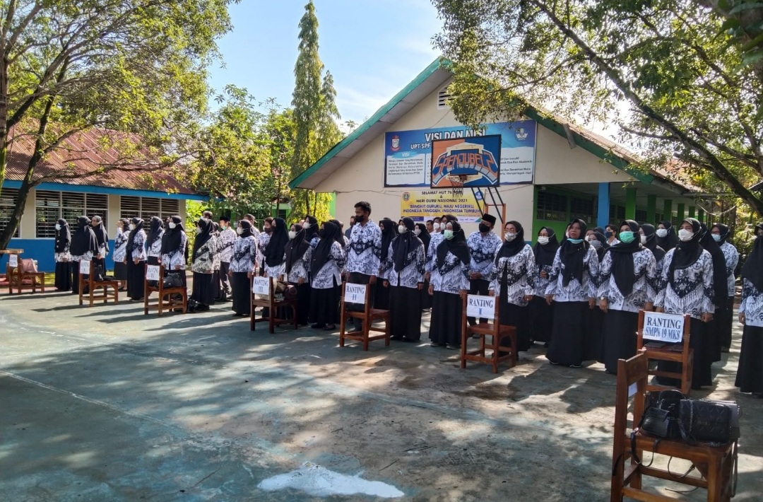 BN Online, Makassar–Dalam rangka memperingati Hari Guru Nasional sekaligus ke 71 dan Persatuan Guru Republik Indonesia (PGRI) ke-76 melaksanakan upacara dilapangan uPT SPF SMP Negeri 17 Makassar se kecamatan Manggala dirangkai dengan pemberian penghargaan kepada sang juara yang telah berhasil mengukir prestasi di Porseni, Senin (22/11/2021).