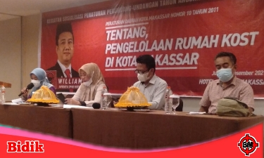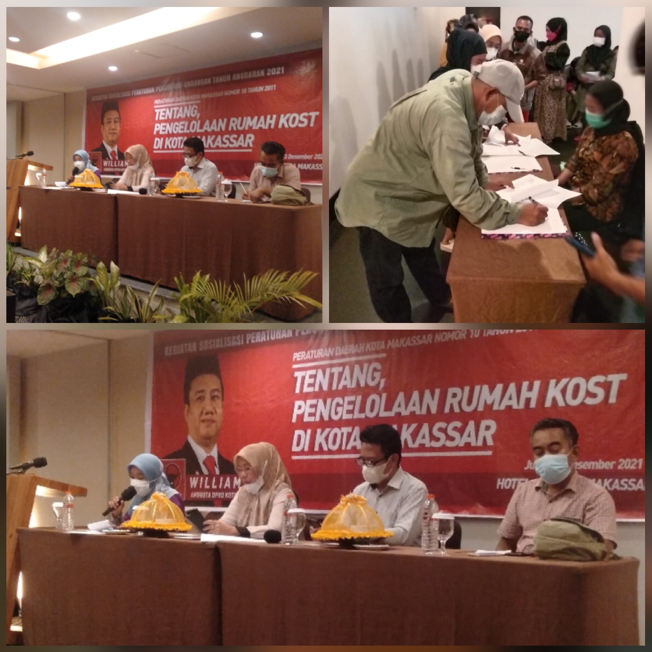 BN Online, Makassar–Legislator Dewan Perwakilan Rakyat Daerah (DPRD) Kota Makassar, William, melakukan sosialisasi Peraturan Daerah (Perda) Nomor 10 Tahun 2011 Tentang Pengelolaan Rumah Kost dalam rangka penyebarluasan informasi dan produk hukum, yang digelar di Hotel Santika jalan Sultan Hasanuddin No.40 Makassar, Jumat (03/12/21).