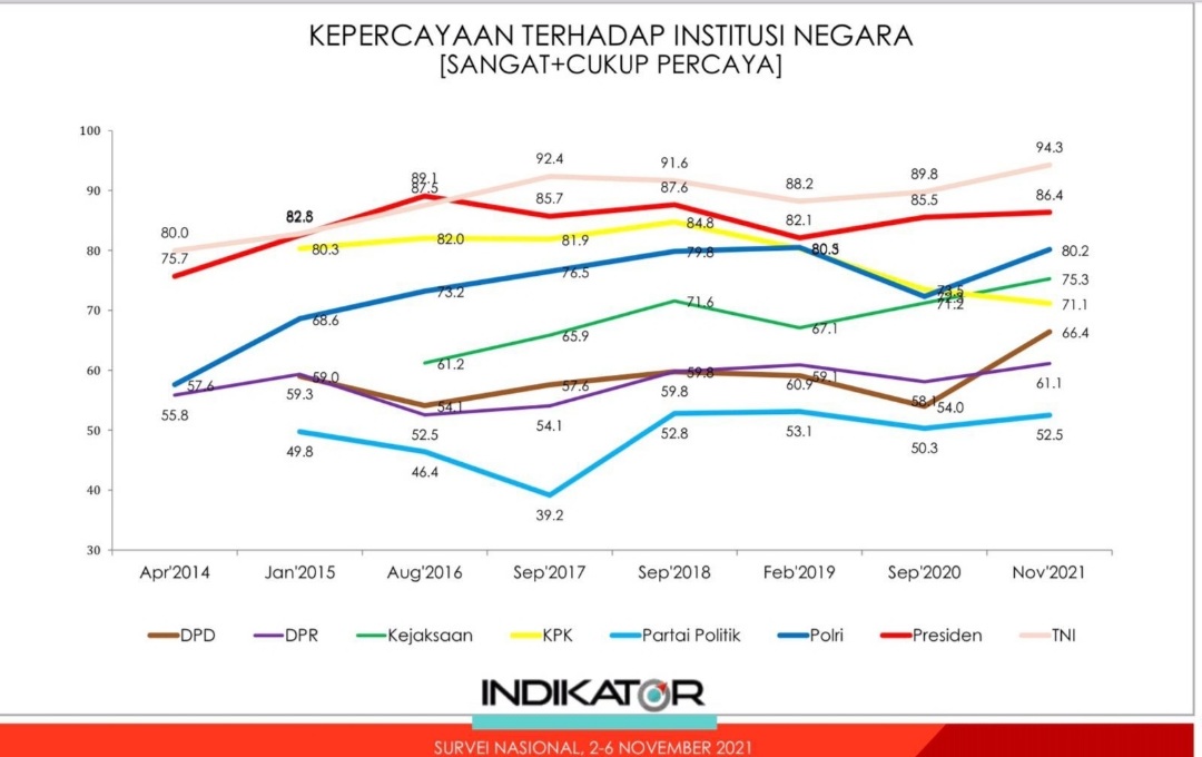 Berikut grafik survei kepercayaan masyarakat terhadap Polri dari tahun 2014 hingga 2021 berdasarkan data Indikator Politik Indonesia. Tahun 2014 sebesar 57,5 persen, 2015 sebesar 68,6 persen, 2016 sebesar 73,2 persen, 2017 sebesar 76,5 persen, 2018 sebesar 79,8 persen, 2019 sebesar 80 persen, 2020 sebesar 72% dan di tahun 2021 80,2%.