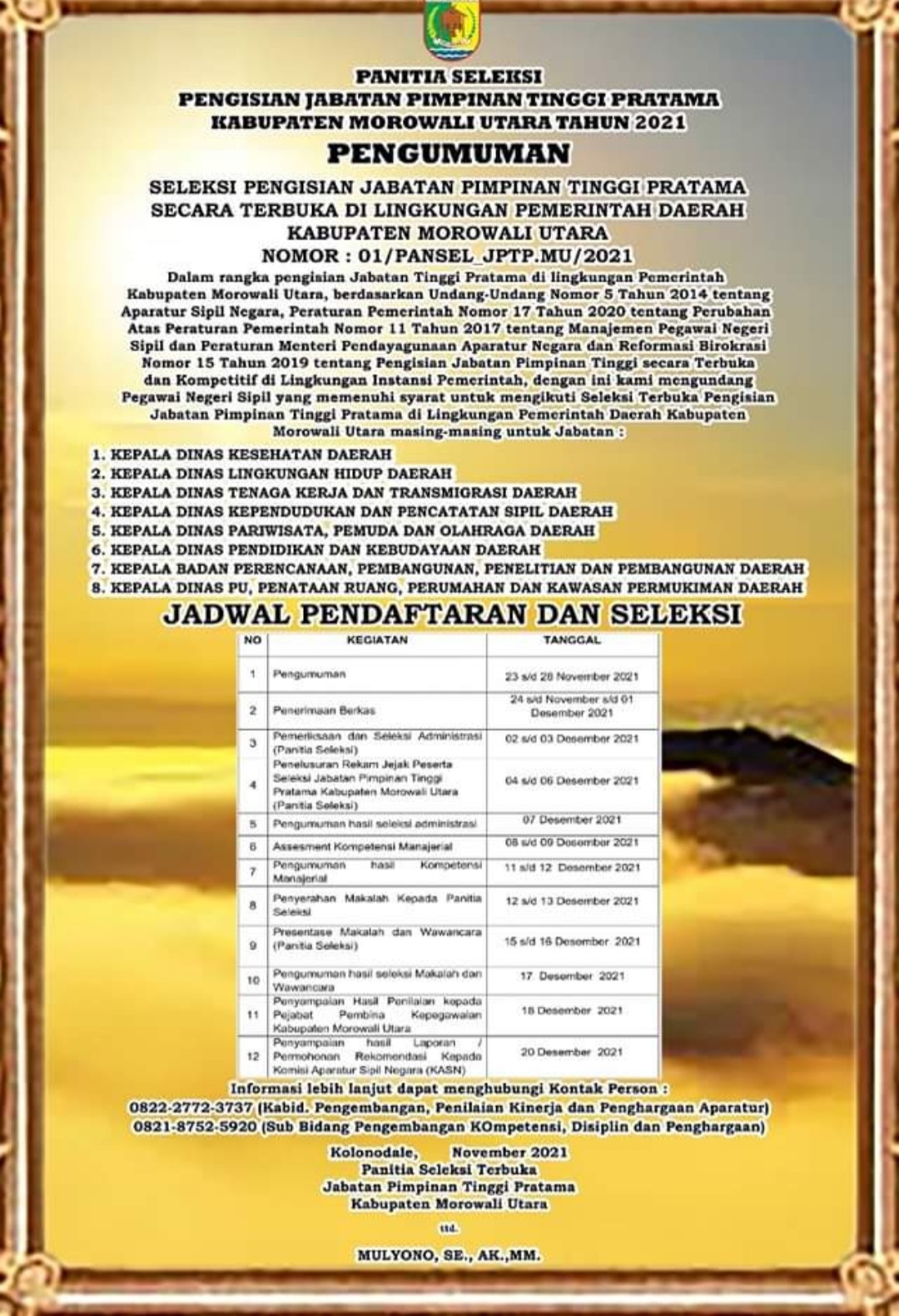 BN Online, Morut–Sejumlah 37 orang pejabat lolos berkas untuk mengikuti tahapan selanjutnya seleksi pengisian delapan jabatan Pimpinan Tinggi Pratama atau eselon dua di lingkungan Pemda Kabupaten Morowali Utara.
