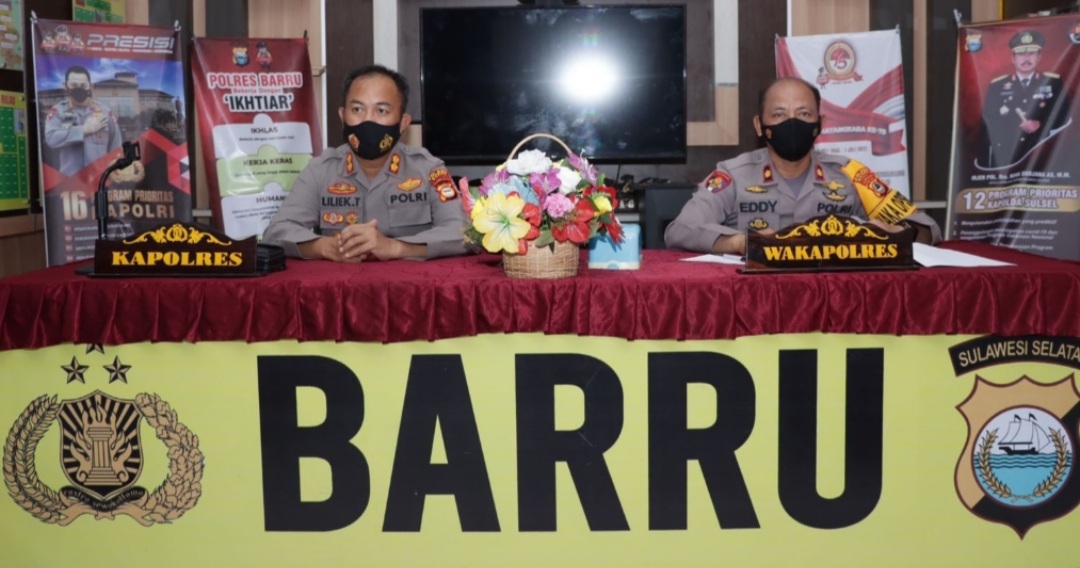BN Online, Barru – Kapolres Barru, AKBP. Liliek Tribhawono S.IK.MM., didampingi Wakapolres Barru, Kompol Eddy Sumantri, S.Sos. MH., menggelar Press Release pengungkapan kasus selama tahun 2021, di Mapolres Barru,pada Senin (3/1/2021).
