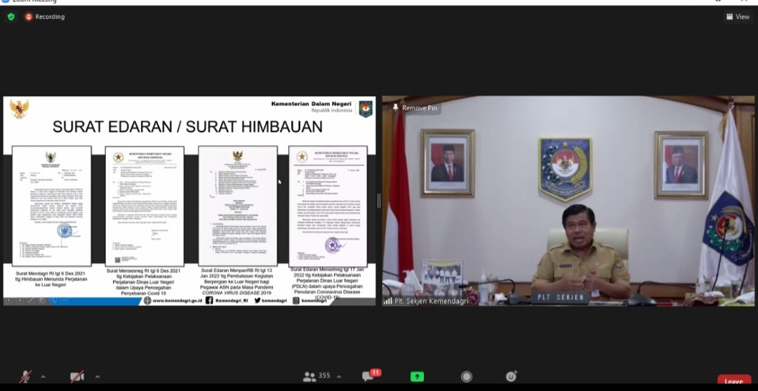 Ketiga, Surat Edaran Menteri Pendayagunaan Aparatur Negara dan Reformasi Birokasi (MenPANRB) pada 13 Januari 2022 tentang Pembatasan Kegiatan Bepergian ke Luar Negeri bagi Pegawai ASN pada Masa Pandemi Covid-19. Keempat, Surat Edaran Mensesneg pada 17 Januari 2022 tentang Kebijakan Pelaksanaan Perjalanan Dinas Luar Negeri dalam Upaya Pencegahan Penularan Covid-19.