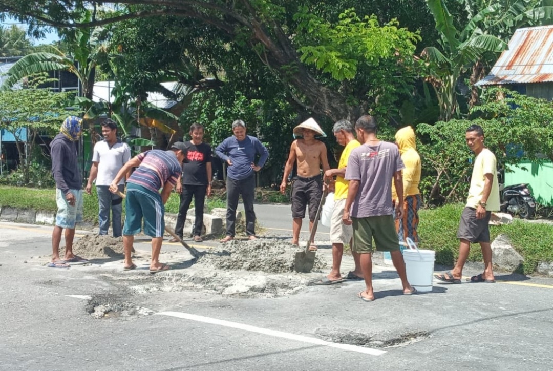 Kepala Dinas PU Barru, Drs. Baharuddin menggalang masyarakat setempat untuk swadaya bergotong royong menutup lubang dengan bahan pasir dan semen yang disumbangkan oleh Pemda Barru, Ahad (23/1/2022).