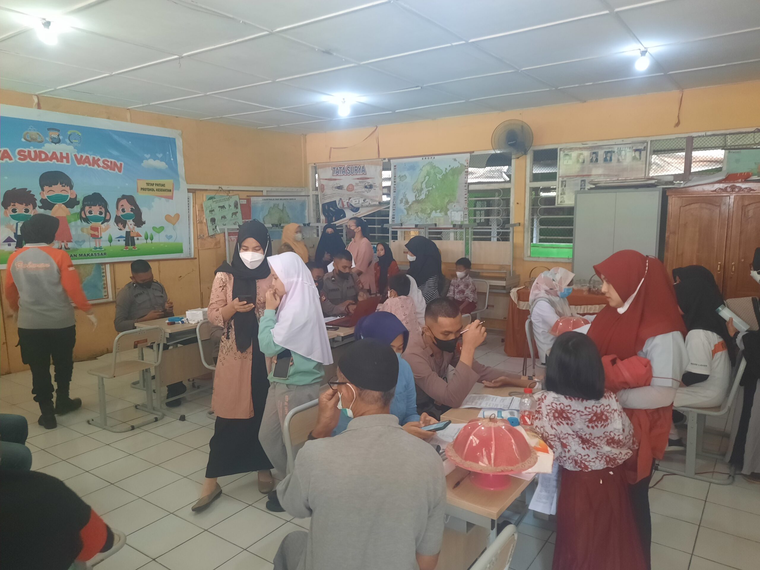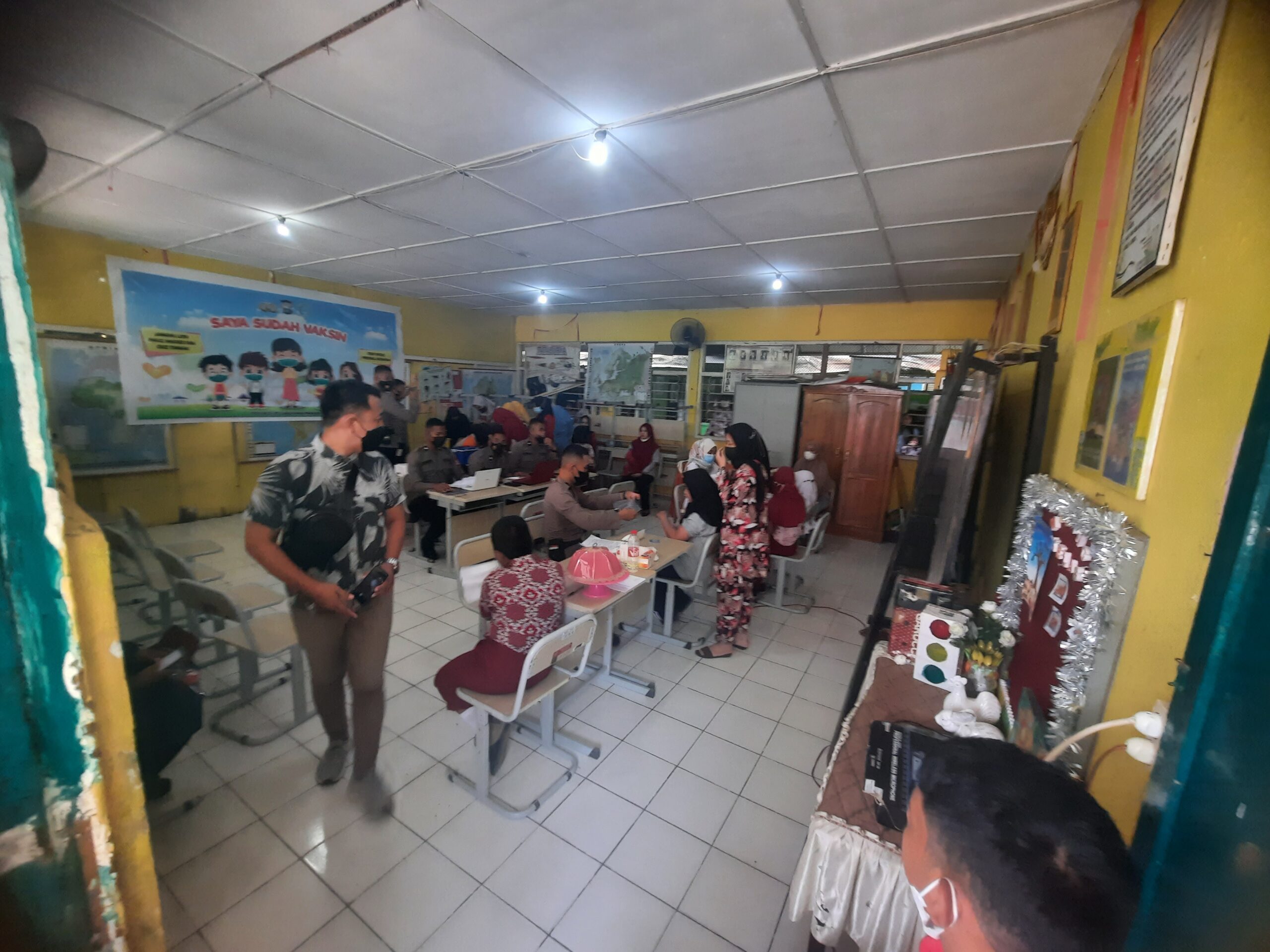 Vaksinasi ini hari dilaksanakan untuk kelas 4, 5, 6, dan anak-anak yang sudah vaksin ini mendapatkan bingkisan dari Polres Pelabuhan bekerjasama dengan Polsek Kecamatan Wajo.