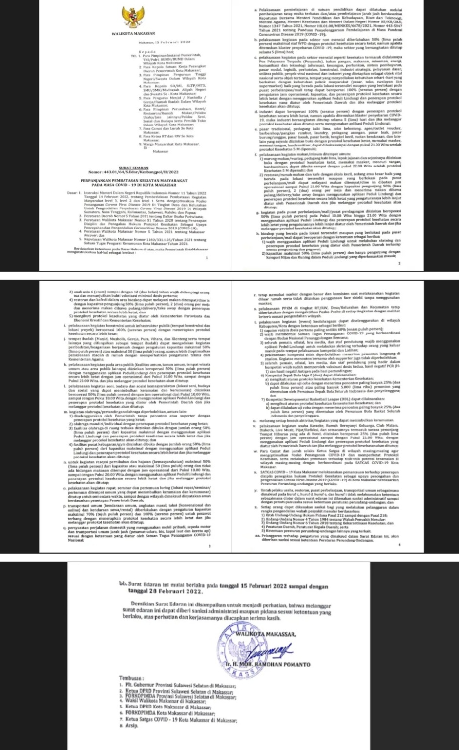 Surat Edaran Wali Kota Makassar terkait aturan Pemberlakuan Pembatasan Kegiatan Masyarakat di Kota Makassar yang statusnya naik dari level 2 ke level 3, Selasa (15/2-2022).