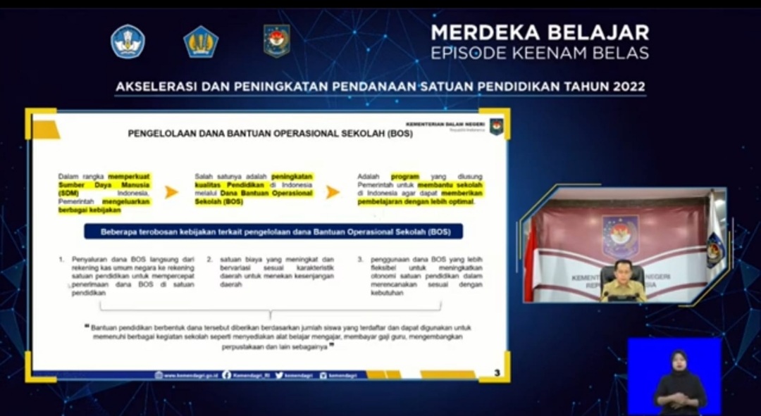 Hal itu disampaikan Fatoni saat memberikan sambutan mewakili Menteri Dalam Negeri (Mendagri) Muhammad Tito Karnavian dalam acara Peluncuran Merdeka Belajar Episode 16 bertajuk “Akselerasi dan Peningkatan Pendanaan Satuan Pendidikan” secara virtual, Selasa (15/2/2022).