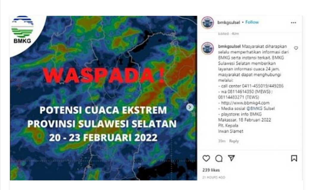 Makassar sendiri hingga saat ini masih di guyur hujan dan angin kencang. BMKG Makassar menggeluarkan imbauan peringatan dini cuaca di wilayah Sulawesi Selatan.