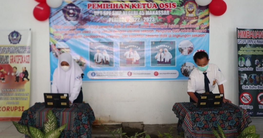 BN Online, Makassar—UPT SPF SMP Negeri 45 Makassar menggelar pesta demokrasi Pemilihan Ketua OSIS pada hari Senin, 15 Februari 2022 yang dimulai sejak pukul 08.00-12.30 WITA bertempat di UPT SPF SMP Negeri 45, di Jl. Timor Nomor 79 Kecamatan Wajo, Kota Makassar.
