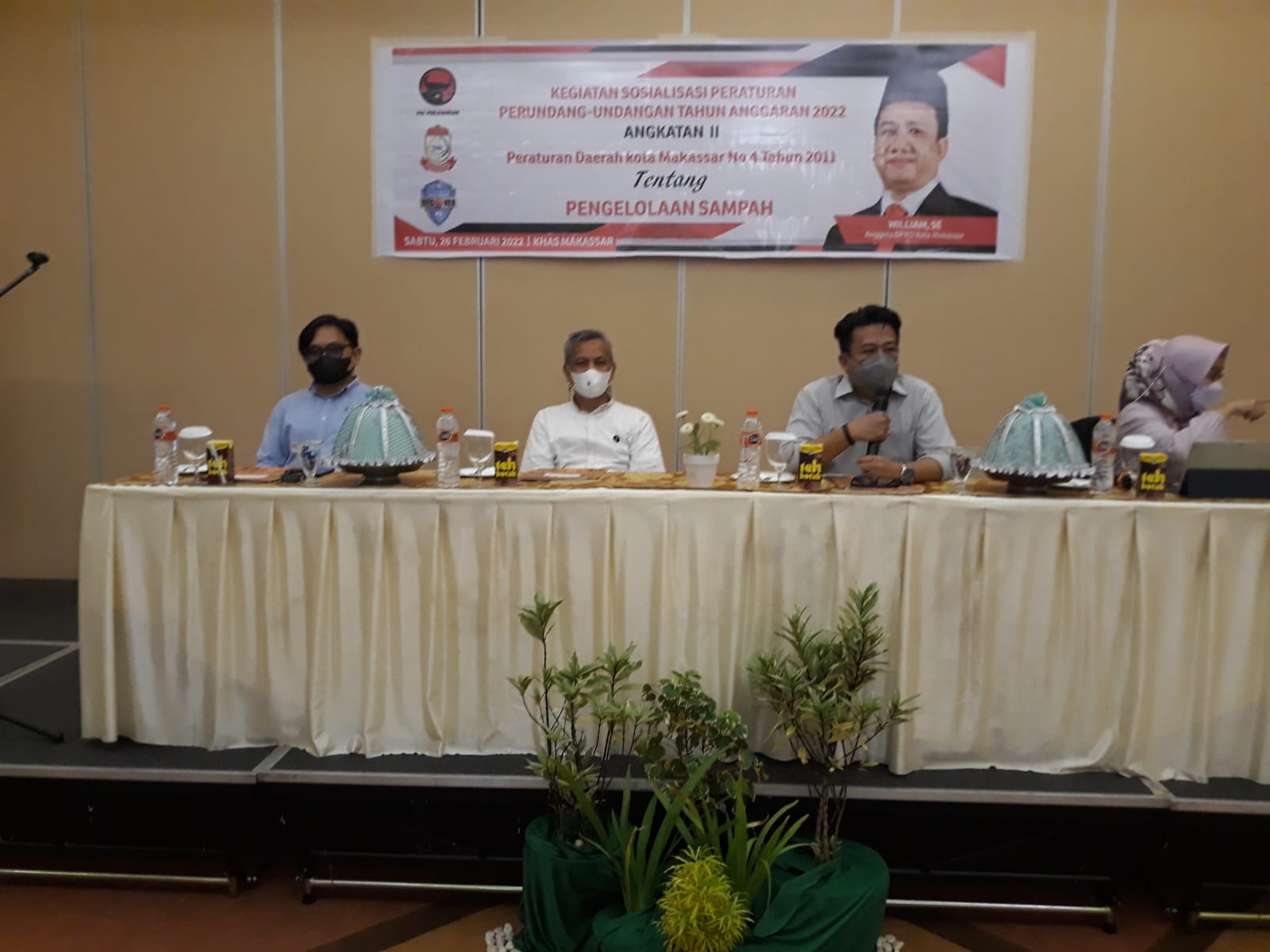 BN Online Makassar, — Anggota DPRD Kota Makassar, William menggelar Kegiatan Sosialisasi Peraturan Perundang-undangan Tahun Anggaran 2022, Angkatan II, Peraturan Daerah (Perda) No 4 tahun 2011 tentang Pengelolaan Sampah di Khas Hotel Makassar Jalan Mappanyukki No.49, Sabtu (26/2/2022).