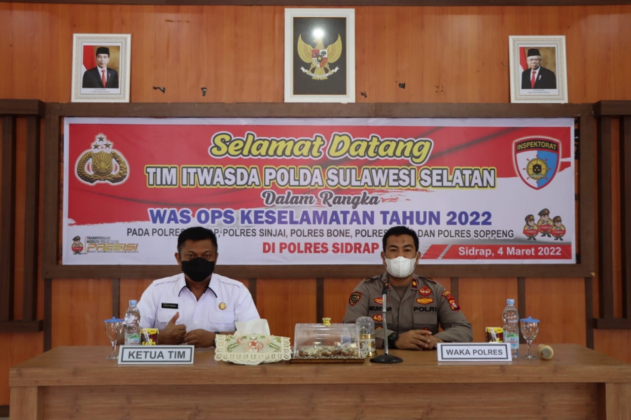 BN Online, Sidrap— Tim Audit Inspektorat Pengawasan Daerah (Itwasda) Kepolisian Daerah (Polda) Sulawesi Selatan (Sulsel) mengunjungi Polres Sidrap Jalan Bau Massepe No. 01, Kelurahan Pangkajene, Kecamatan Maritengngae, Kabupaten Sidrap, Jumat 04 Maret 2022.