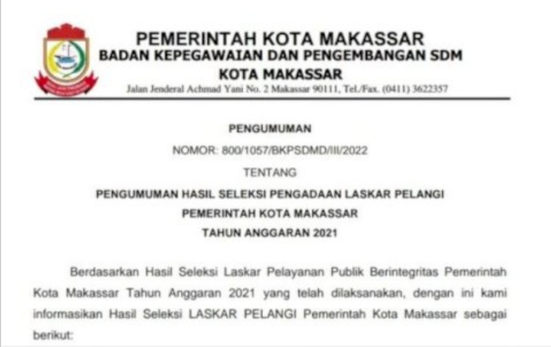 BN Online, Makassar--Pemerintah Kota (Pemkot) Makassar telah mengumumkan hasil seleksi Laskar Pelayanan Publik Integritas (Laskar Pelangi).