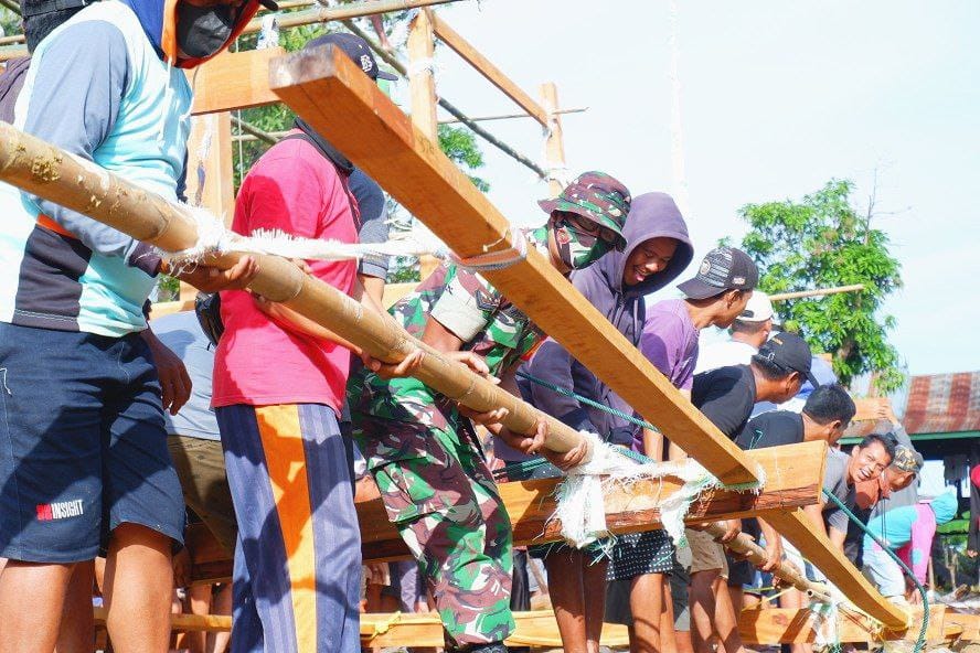 Terbukti saat Babinsa Koramil 1420-03 jajaran Kodim 1420 Sidrap, Serda Muh. Asri terlihat bergotong royong membantu warga binaannya berdirikan rumah di Dusun 3 Pakenya Desa Sereang Kecamatan Maritengngae Kabupaten Sidrap, Senin (07/03/2022) pagi.