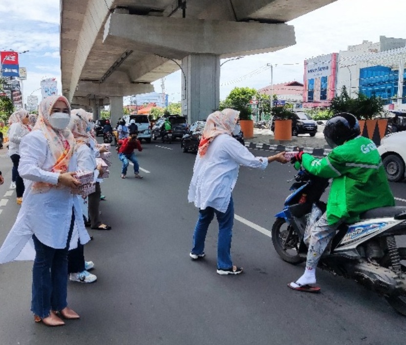 Mereka membagikan makanan siap santap kepada sejumlah pengemudi Ojol dan Bentor disepanjang Jalan A.P Pettarani Makassar, Jumat (25/03/2022).