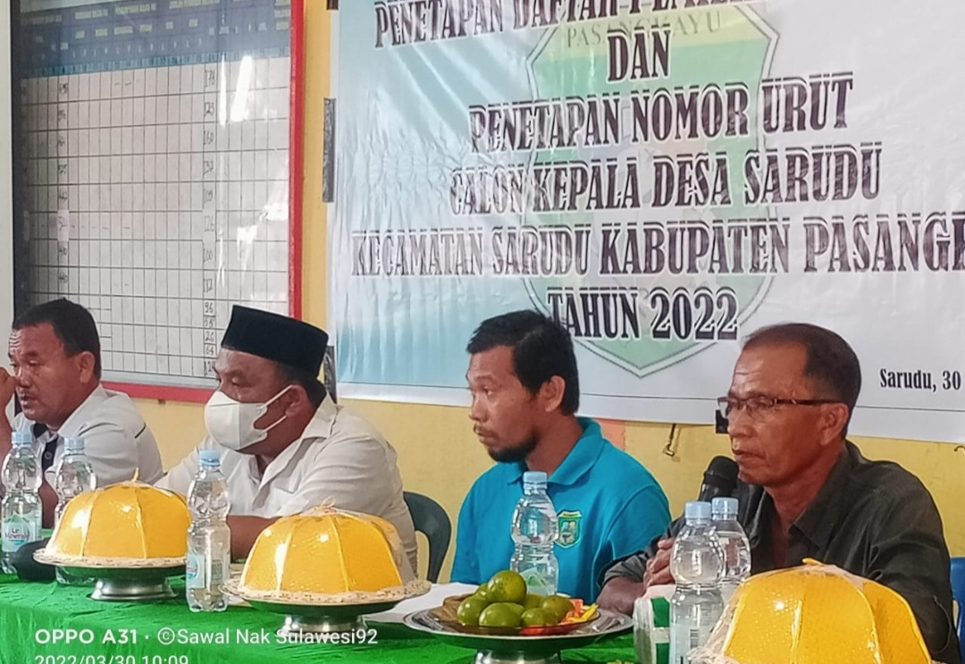 Adapun hasil penetapan nomor urut calon Kades Sarudu yang dipandu ketua Pilakdes Irfan, Sos, yakni Mustakim. M nomor Urut 3, Muh Jeki, S.Sos nomor urut 2, Ippong nomor urut 4 dan Muh Sahril, SH nomor urut 1.