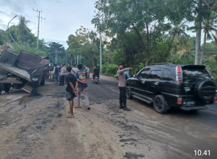 “Lakalantas tunggal itu melibatkan sebuah Mobil Dump Truck pengangkut matrial pasir serta sempat menyebabkan terjadinya kemacetan arus lalulintas di TKP” ungkap Kapolsek.