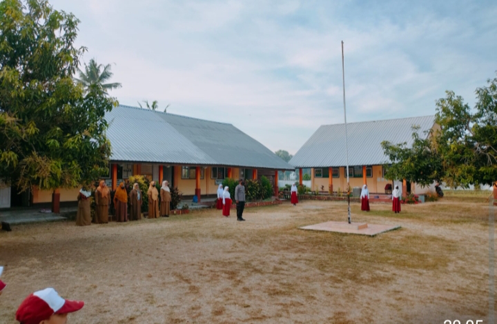 Bhabinkamtibmas Desa Desaloka Brigadir Heri Syahrial Bastama anggota Polsek Seteluk melaksanakan upacara bendera di lapangan SDN 1 Rempe Kecamatan Seteluk Kabupaten Sumbawa Barat, pada senin 1 agustus 2022.