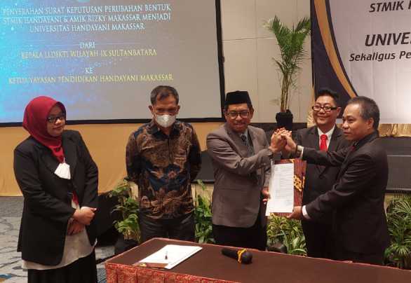 BN Online, Makassar – Setelah 26 tahun berdiri sejak tanggal 21 juni 1996, akhirnya Sekolah Tinggi Manajemen Informatika dan Komputer (STMIK) Handayani Makassar resmi berubah menjadi Universitas Handayani Makassar (UHM) berdasarkan penyerahan SK perubahan bentuk STMIK Handayani dan Amik Rizky Makassar menjadi UHM dari kepala LLDIKTI Wilayah IX Sultan Batara ke Ketua Yayasan Pendidikan Handayani Makassar,