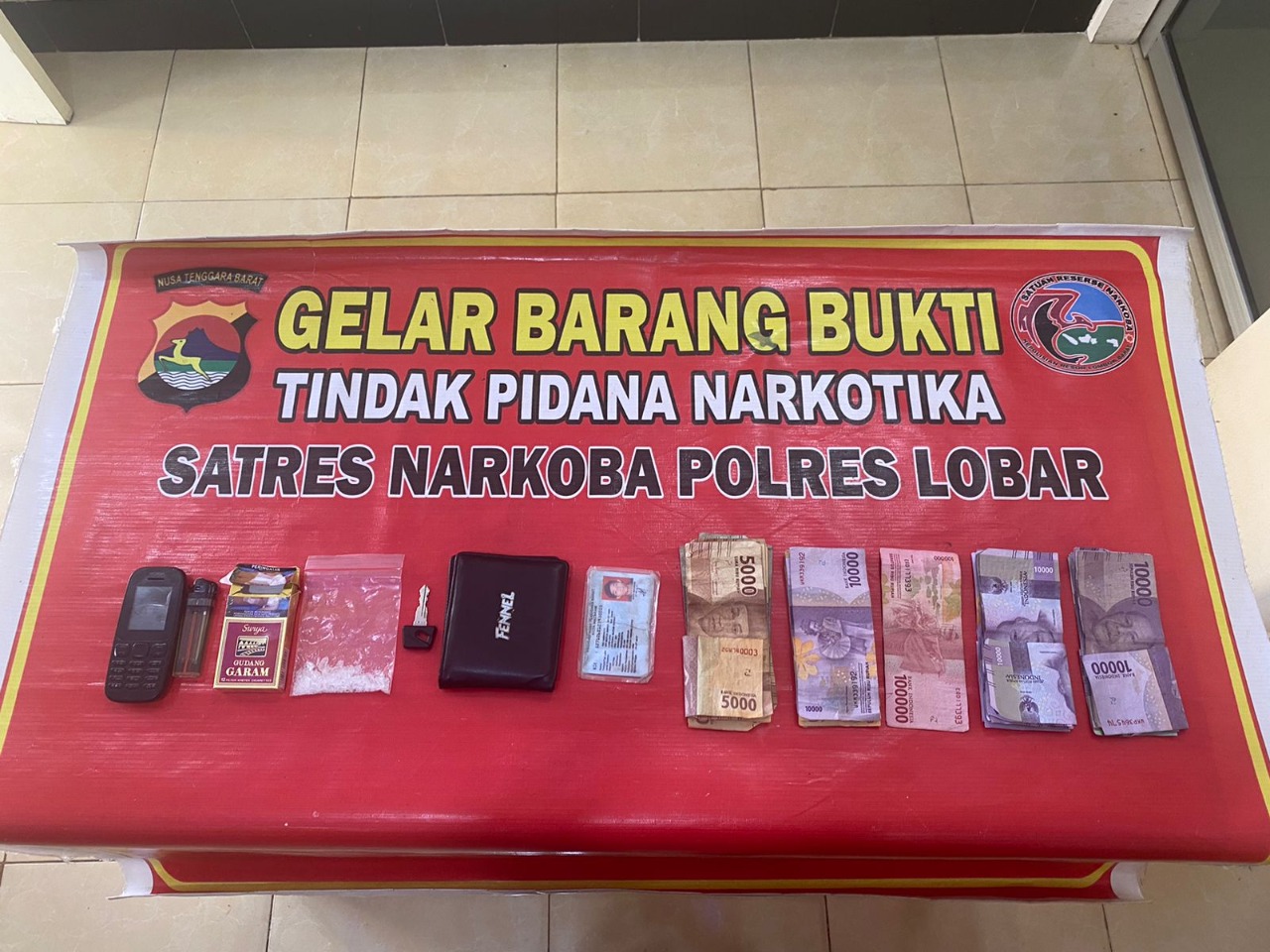 Barang Bukti secara keseluruhan antara lain, sebungkus rokok surya 12 yang di dalamnya berisi satu plastic bening yang diduga narkotika jenis sabu seberat 5.64 gram. Kemudian uang tunai Rp. 445 ribu, satu unit sepeda motor mio warna hitam, sebuah Hp, sebuah korek api dan sebuah dompet.
