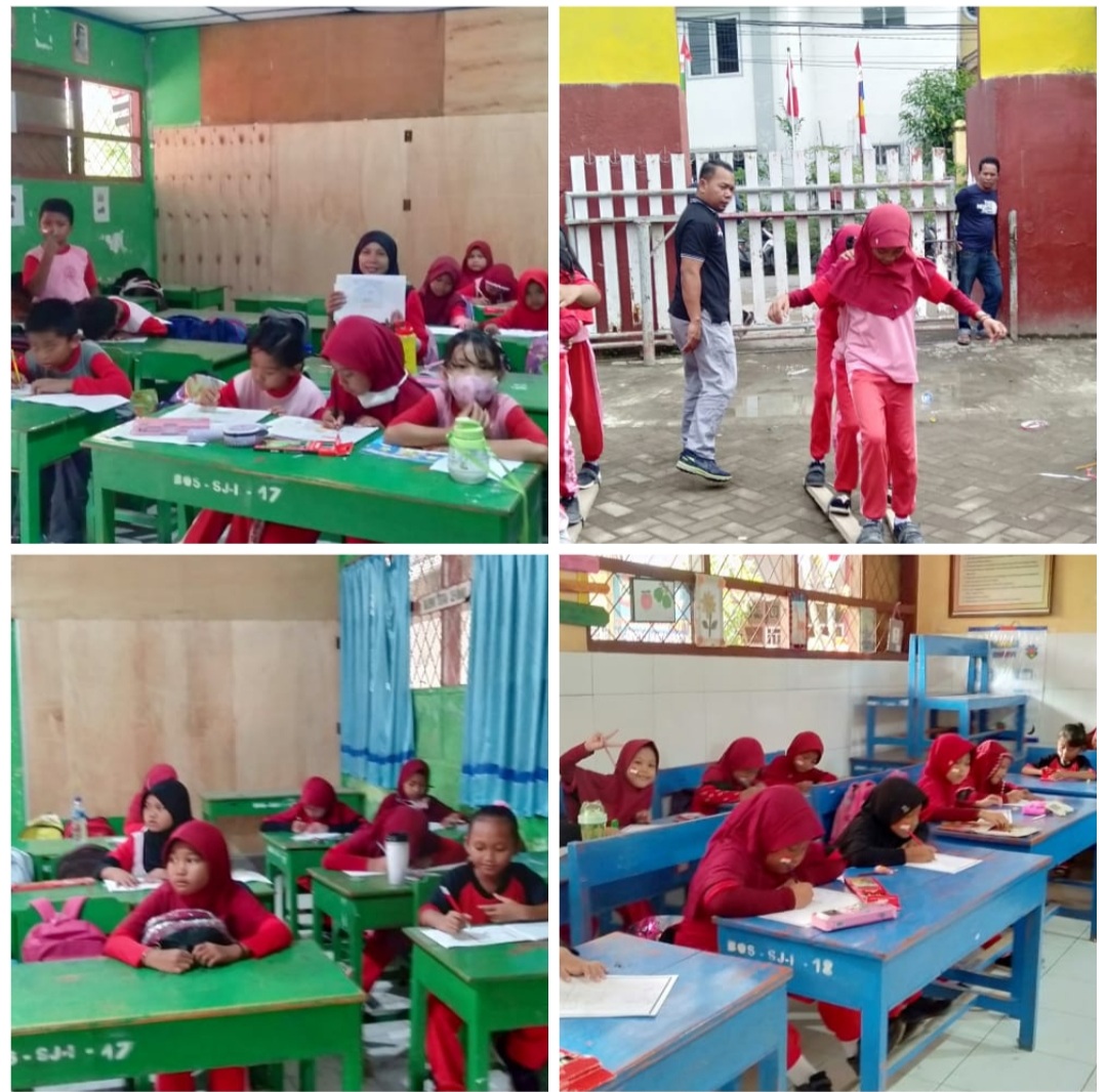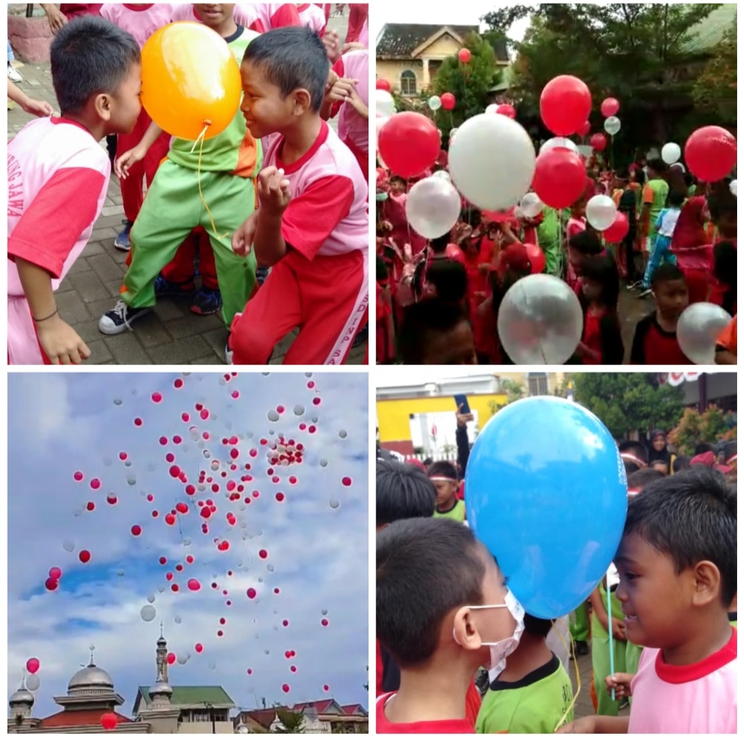 untuk Kelas 4, 5, dan 6, menggambar dengan tema Hari Kemerdekaan, Joget balon, terompa dan lari karung.