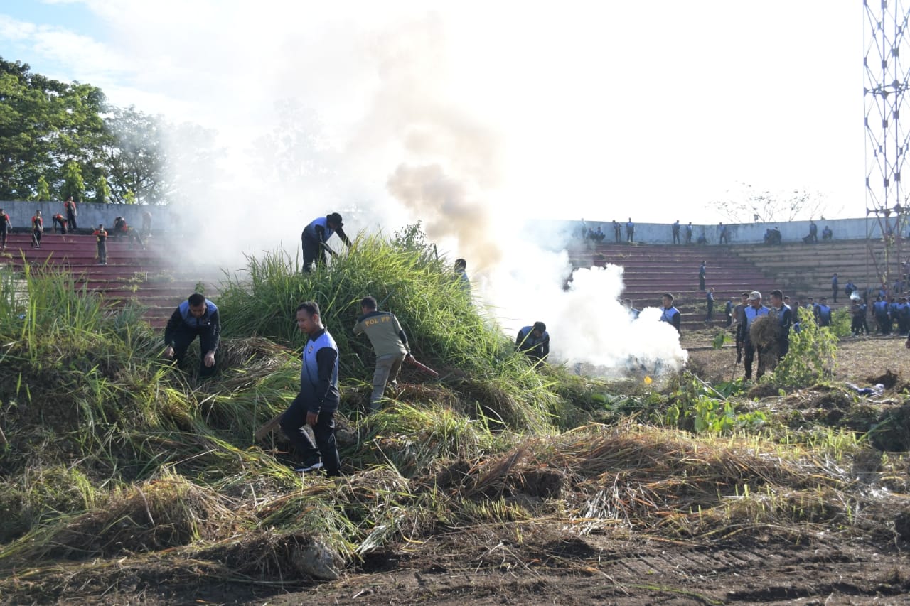 BN Online, Sulbar —Kerahkan eskapator dan 5.000 ASN terdiri dari lingkup Pemprov, Pemkab Mamuju, Instansi Vertikal Polda, TNI melakukan pembersihan stadion Manakarra Mamuju.
